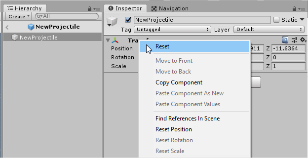 7. 계층 구조 창 에서 객체를 선택하고 인스펙터 창 에서 변환 구성 요소를 마우스 오른쪽 버튼으로 클릭하십시오 . 그런 다음 재설정을 클릭하십시오. 이 GameObject의 위치, 회전 및 스케일에 대한 기본값을 설정합니다 . 그렇게하지 않으면 발사체가 올바른 위치에 생성되지 않거나 다른 회전으로 생성되지 않을 수 있기 때문에 중요합니다.