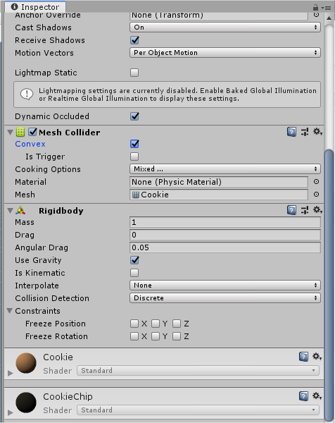 1. 쿠키 메시에 물리를 추가하여 발사 할 때 공기 나 벽에 달라 붙지 않고 충돌하고 넘어 지도록합시다. Impact VFX 로 간단한 메시를 사용하는 대신 이전과 같이 만들 프리 팹을 사용합니다.