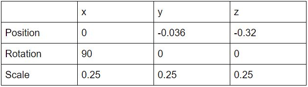 12. 이제이 메시 의 Transform 컴포넌트 에서 일부 값을 변경 하여 발사체의 시각으로 사용합니다. 이 특정 메쉬의 경우 다음 값이 효과적입니다. 다른 메시를 사용하는 경우 발사체의 앞면이 파란색 화살표 (정방향)와 정렬되고 발사체의 길이가 대략 0.5 미터 미만인지 확인하려고합니다.