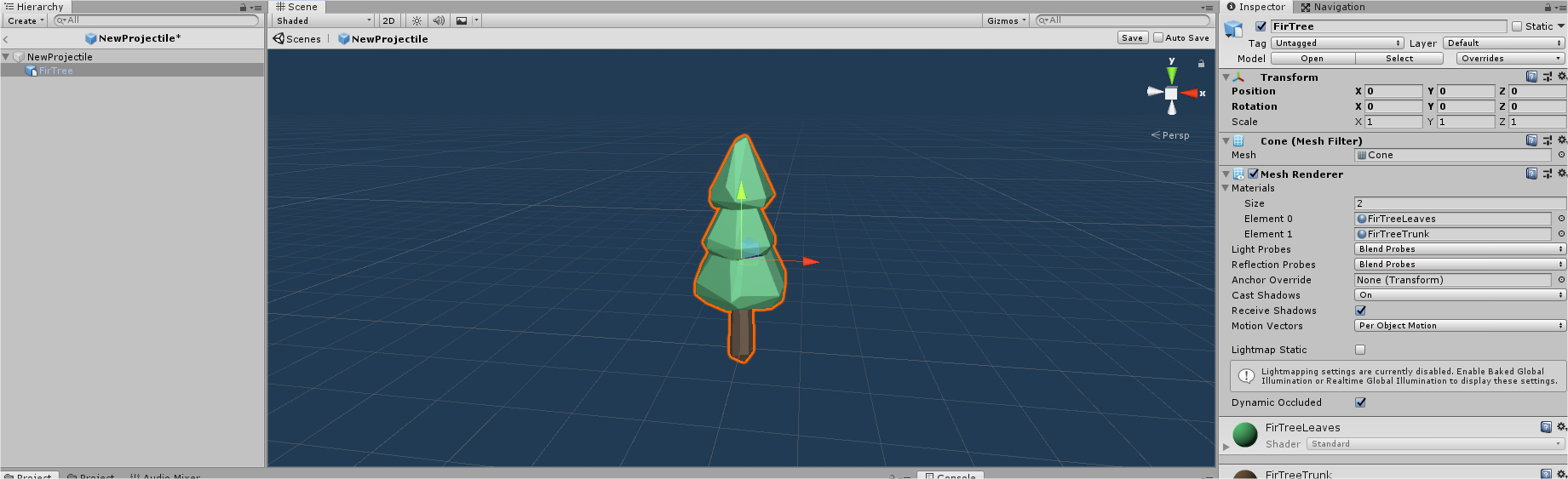 11. 메시가 이제 장면 뷰에 나타납니다 . 팁 : 장면 뷰 위로 마우스를 가져 가면 키보드에서 F를 눌러 현재 선택된 계층 구조 (이 경우 FirTree)에 카메라를 중앙에 놓습니다.