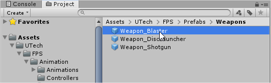 1. Project 창에서 Assets> UTech> FPS> Prefabs> Weapons 로 이동하여 선택한 무기의 Prefab 을 두 번 클릭하여 엽니 다 .