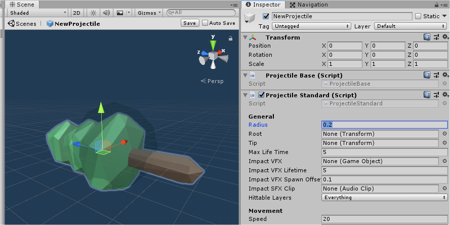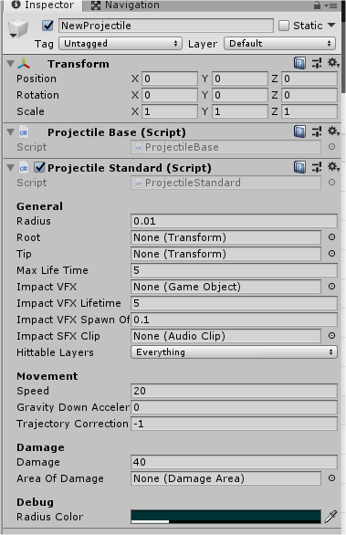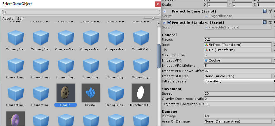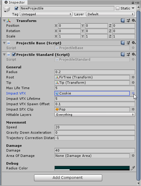 9. Inspector의 Projectile Standard 구성 요소에서 Impact VFX 필드 의 아이콘을 클릭 하여 새 Prefab 을 할당합니다 .