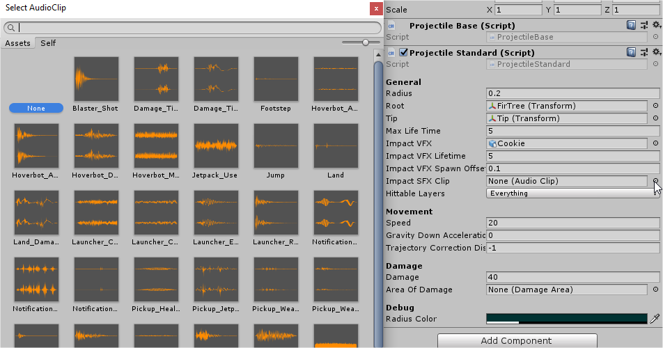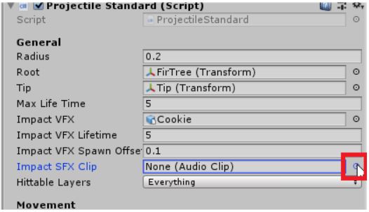 24. 발사체가 무언가와 충돌 할 때 재생할 소리를 선택할 수 있습니다. 인스펙터 창에서 Impact SFX Clip 필드 의 아이콘을 누릅니다 .
