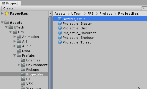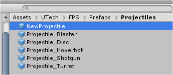 4. 그런 다음 Assets> Utech> FPS> Prefabs> Projectiles 폴더 의 계층 구조 창에서 프로젝트 창으로 새 객체를 드래그해야 합니다.