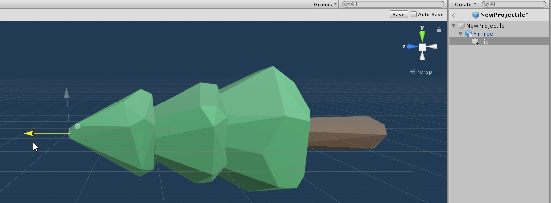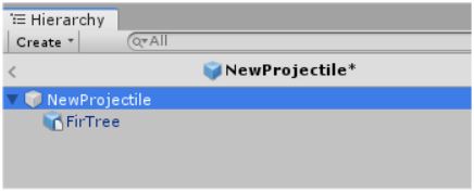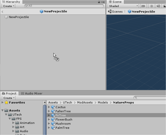 10. 이제 발사체에 메쉬 (3D 모델)를 추가하겠습니다. 에서 프로젝트 창에서에서 당신이 원하는 것을 메쉬, 드래그를 찾을 계층 구조 창을여십시오. 자산> UTech> ModAssets> 모델> NatureProps로 이동하여 몇 가지 옵션을 찾으십시오. 예를 들어 FirTree 메쉬를 계층 창으로 드래그 앤 드롭합니다.