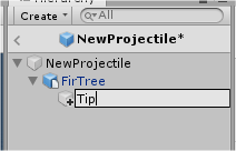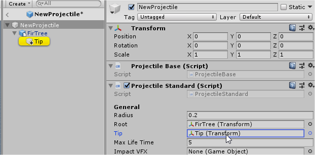 20. 15 단계 에서했던 것처럼 Tip GameObject 를 Hierarchy 창 에서 Projectile Standard 컴포넌트 의 Tip 매개 변수로 드래그합니다 .