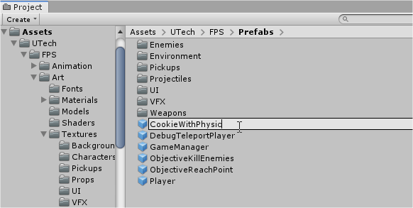 2. 프로젝트 창에서 자산> UTech> FPS> 프리 팹으로 이동하십시오. 쿠키 게임 오브젝트 를 클릭 하여 계층 에서 프로젝트 창으로, 프리 팹 폴더 로 드래그하십시오 . 팝업 창에서 Original Prefab 을 선택하십시오 .