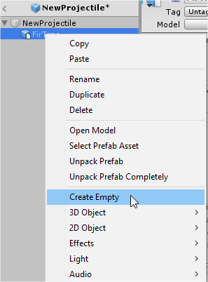 16. 마찬가지로, 발사체의 끝을 발사체 표준 구성 요소에 대한 참조를 제공해야합니다 . 그러나 먼저 만들어야합니다.계층 구조 창 에서 메시를 마우스 오른쪽 버튼으로 클릭 한 후 빈 생성 을 클릭합니다 .