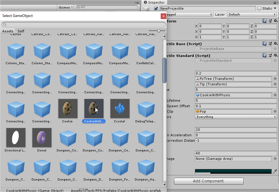 2. 이제 계층 에서 무기가 선택되었으며 Inspector 에서 해당 정보를 볼 수 있습니다 . 인스펙터 에서 Projectile Standard 컴포넌트 아래 Projectile Prefab 필드를 찾습니다 . 생성 한 발사체를 프로젝트 창 에서 해당 필드로 드래그해야합니다 . 따라서 생성 한 발사체를 찾은 다음 한 번 클릭 하고 발사체를 Projectile Prefab 필드 의 Project 창에서 Inspector 창으로 끕니다 .