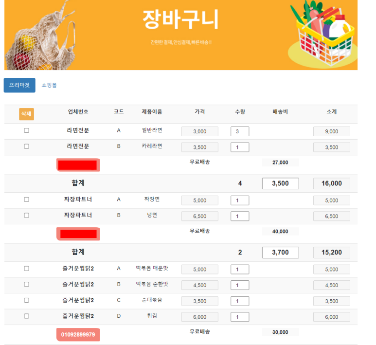 이번 프로젝트는 조금 일반적이지 않은 프로젝트이다. 쇼핑몰과 비슷한데 공급처별로 보여주고 집계를 해서 주문을 하는 프로젝트이다.(아래화면)