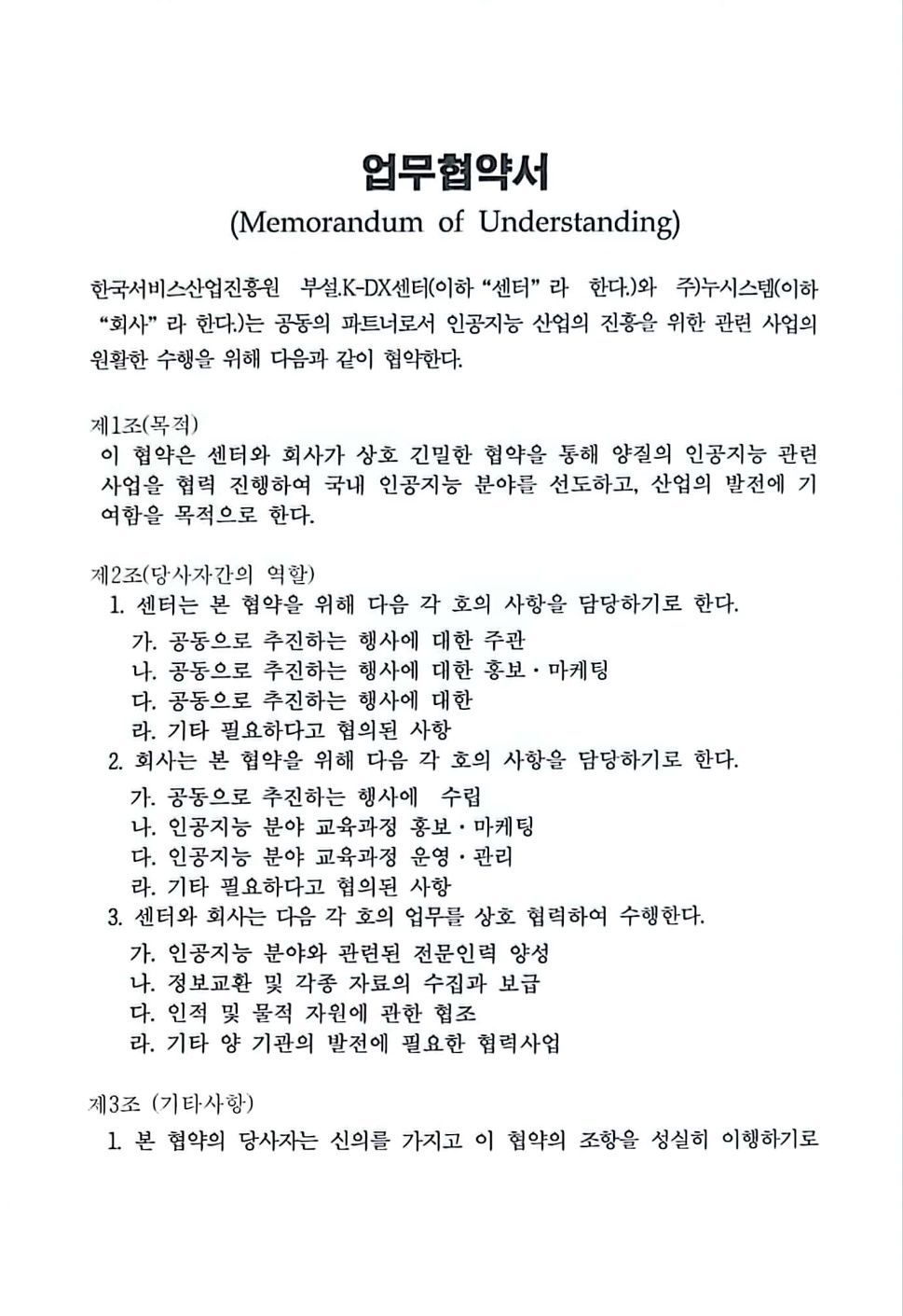 실력있는 미래 인재를 육성하기 위해 한국서비스산업진흥원과 인공지능을 활용한 플랫폼 비지니스 프로젝트 수업을 같이 하기로 업무협약서를 체결했습니다.